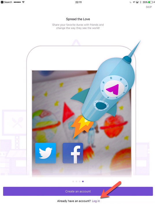 เมื่อติดตั้งเสร็จเรียบร้อยแล้วทำการเปิด Apps Aurasma แตะที่ปุ่ม Create an accout