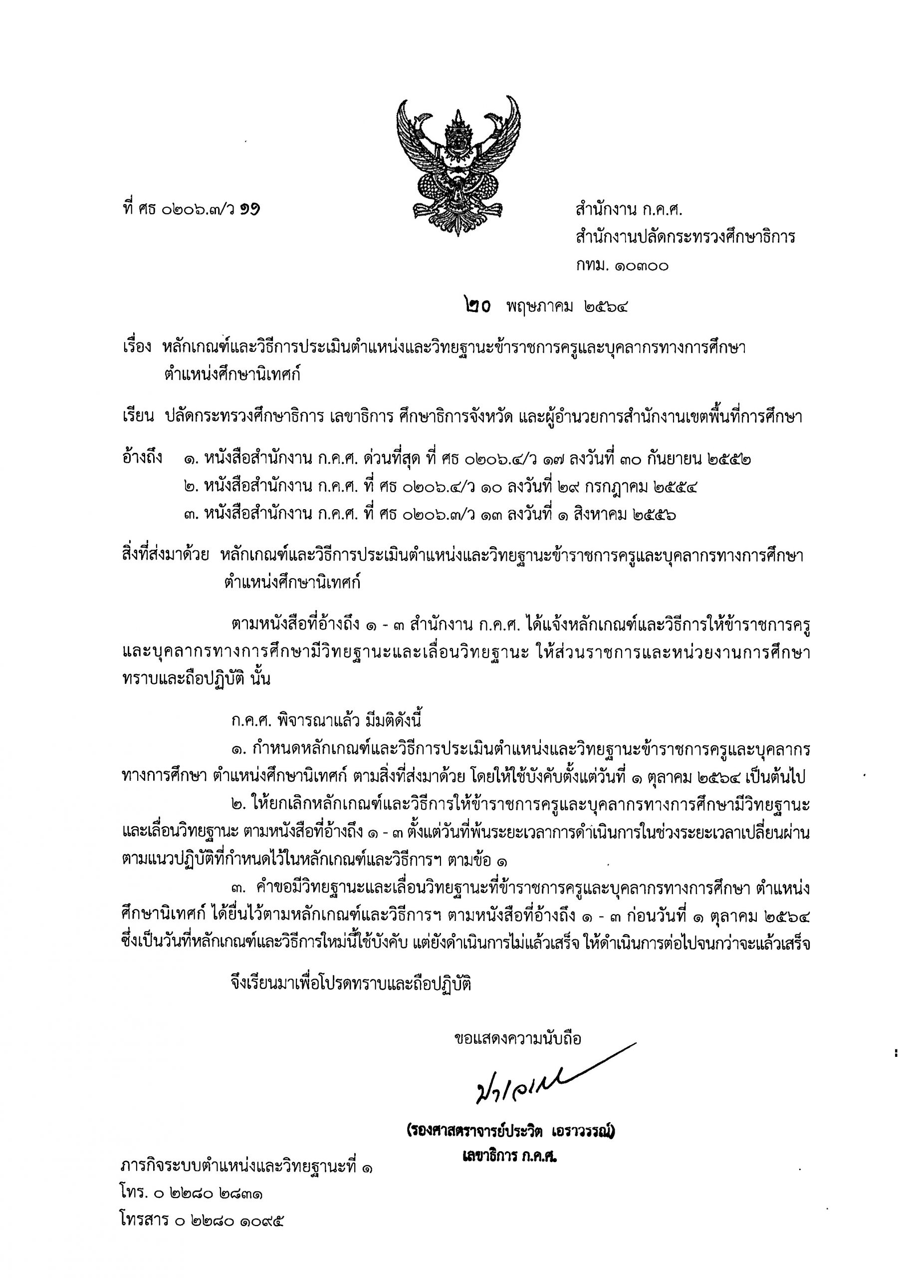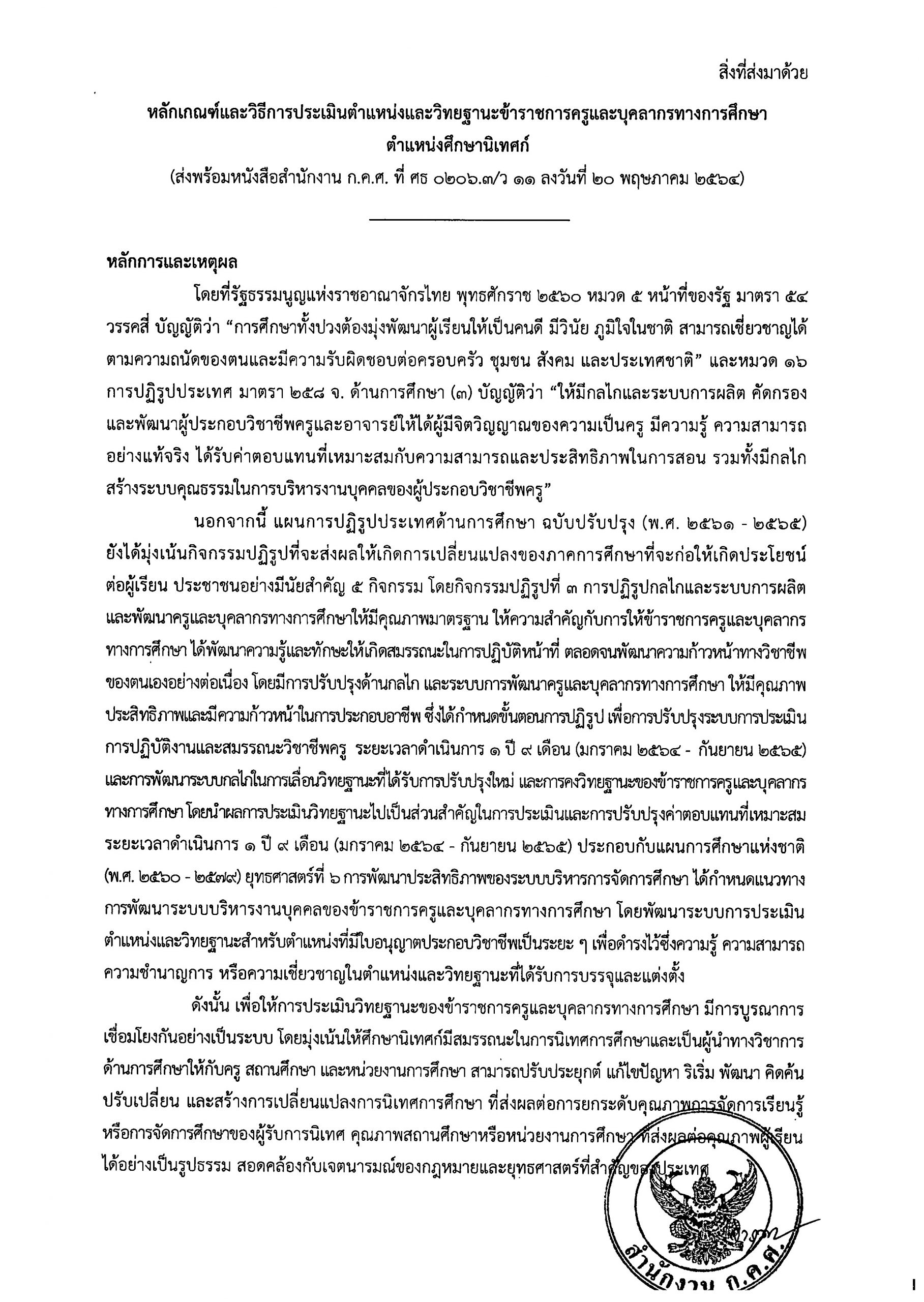 1. กำหนดหลักเกณฑ์และวิธีการประเมินตำแหน่ง และวิทยฐานะข้าราชการครูและบุคลากรทางการศึกษา ตำแหน่งครู ตามสิ่งที่ส่งมาด้วย โดยให้ใช้บังคับตั้งแต่วันที่ 1 ตุลาคม 2564 เป็นต้นไป